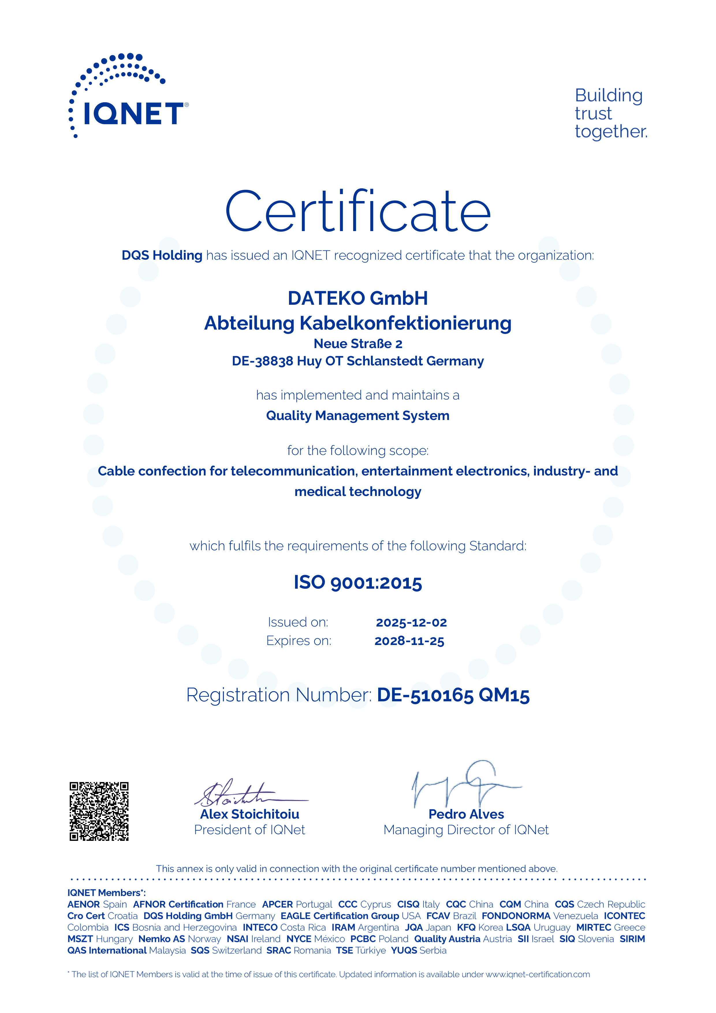Das Qualitätsmanagmentsystem erfüllt die Forderungen des Regelwerkes der ISO 9001 : 2015, nach welchem der Bereich der Kabelkonfektion zertifiziert ist.